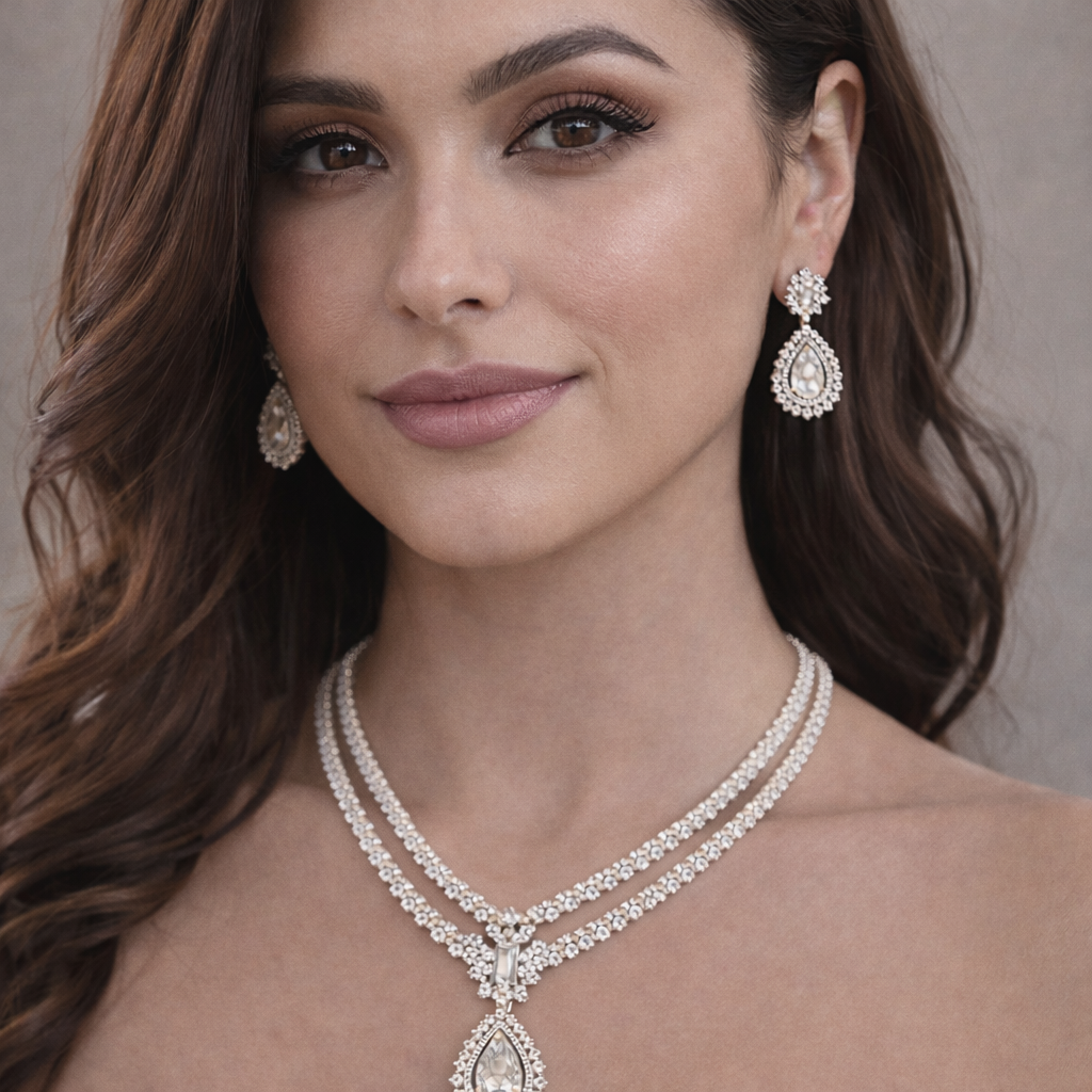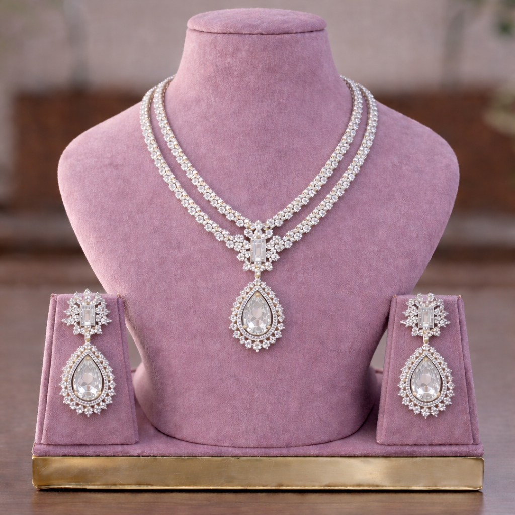 Elegant Double-Chain AD Necklace Set with Teardrop Pendant